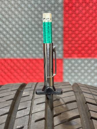 - Tread measures around 8/32 on both tires